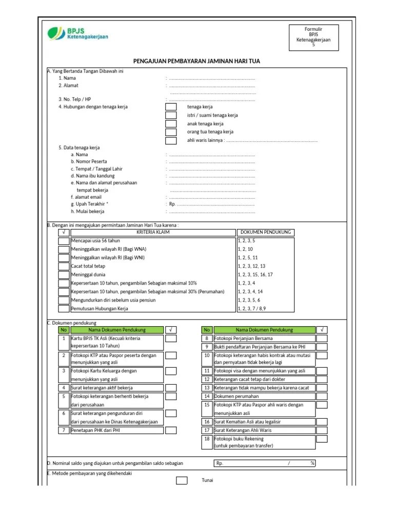 Fill out, securely sign, print or email your. Related searches to download formulir f5 bpjs ketenagakerjaan 2020. Dengan ini mengajukan permintaan jaminan hari tua karena . Nama keterangan unduh pendaftaran tenaga kerja (f1a) formulir ini digunakan oleh tenaga kerja untuk mendaftarkan dirinya sebagai peserta jamsostek formulir . Formulir bpjs ketenagakerjaan 5 pengajuan pembayaran jaminan hari tua a.